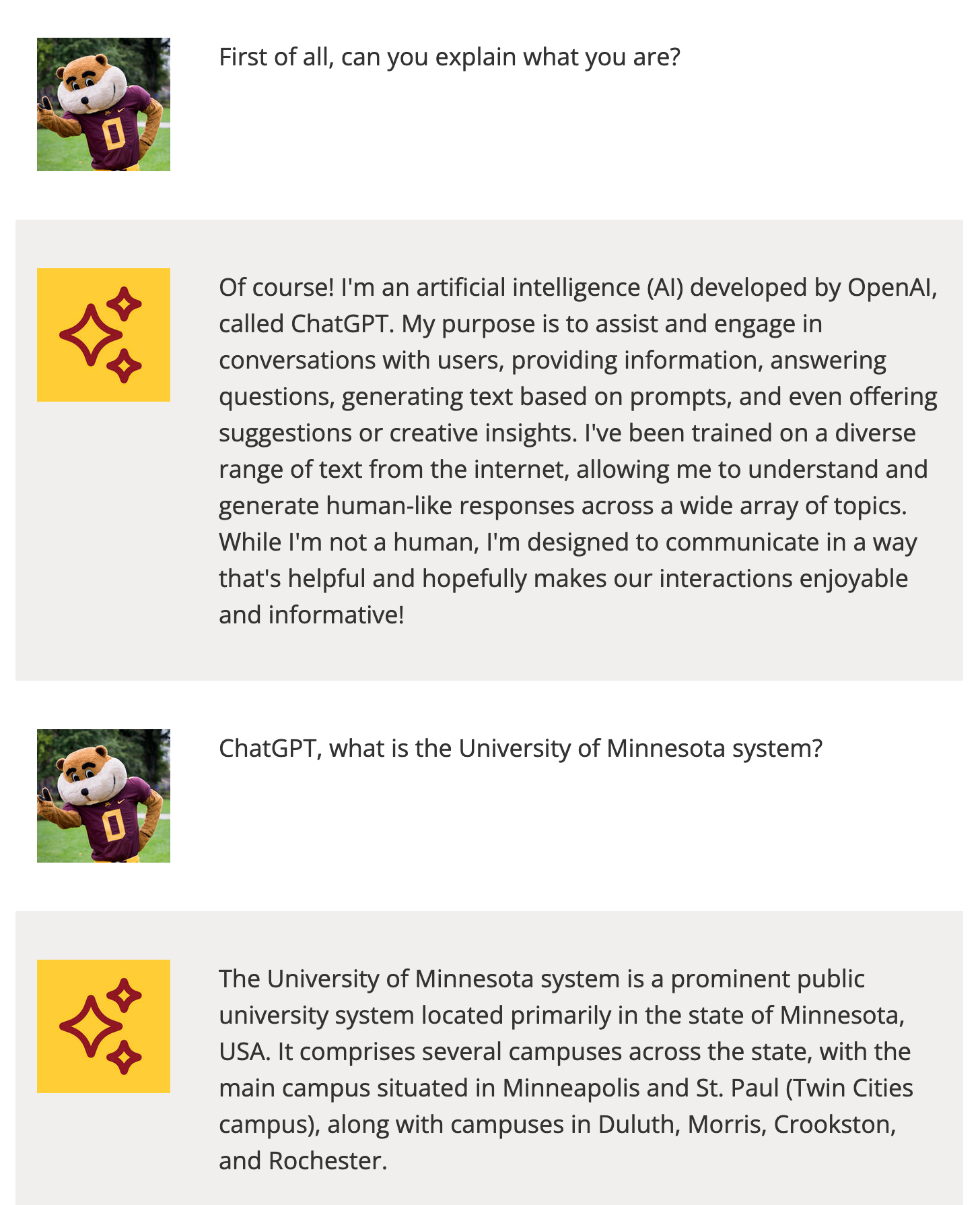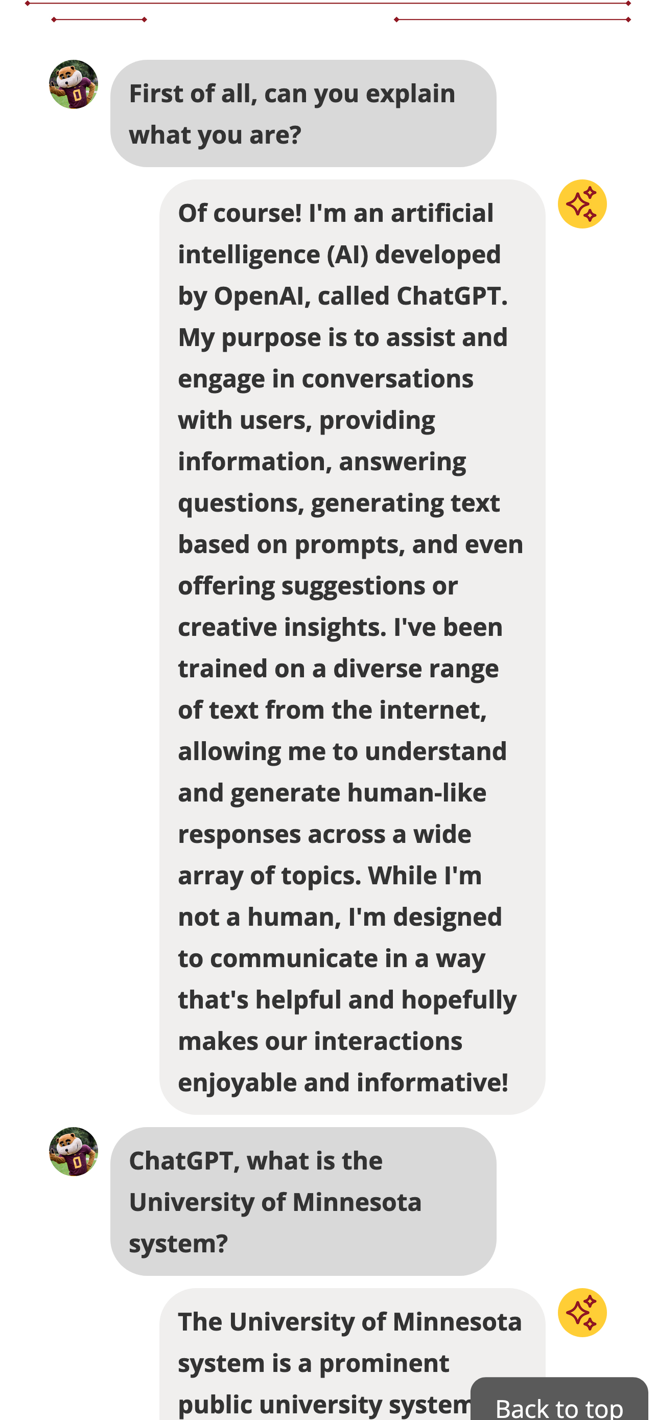 For the article "An Interview with ChatGPT", which features a conversation between the writer and ChatGPT discussing the University of Minnesota, I created a mock chat section. Each text area animates as it enters the viewport, giving the impression of a dynamic conversation.