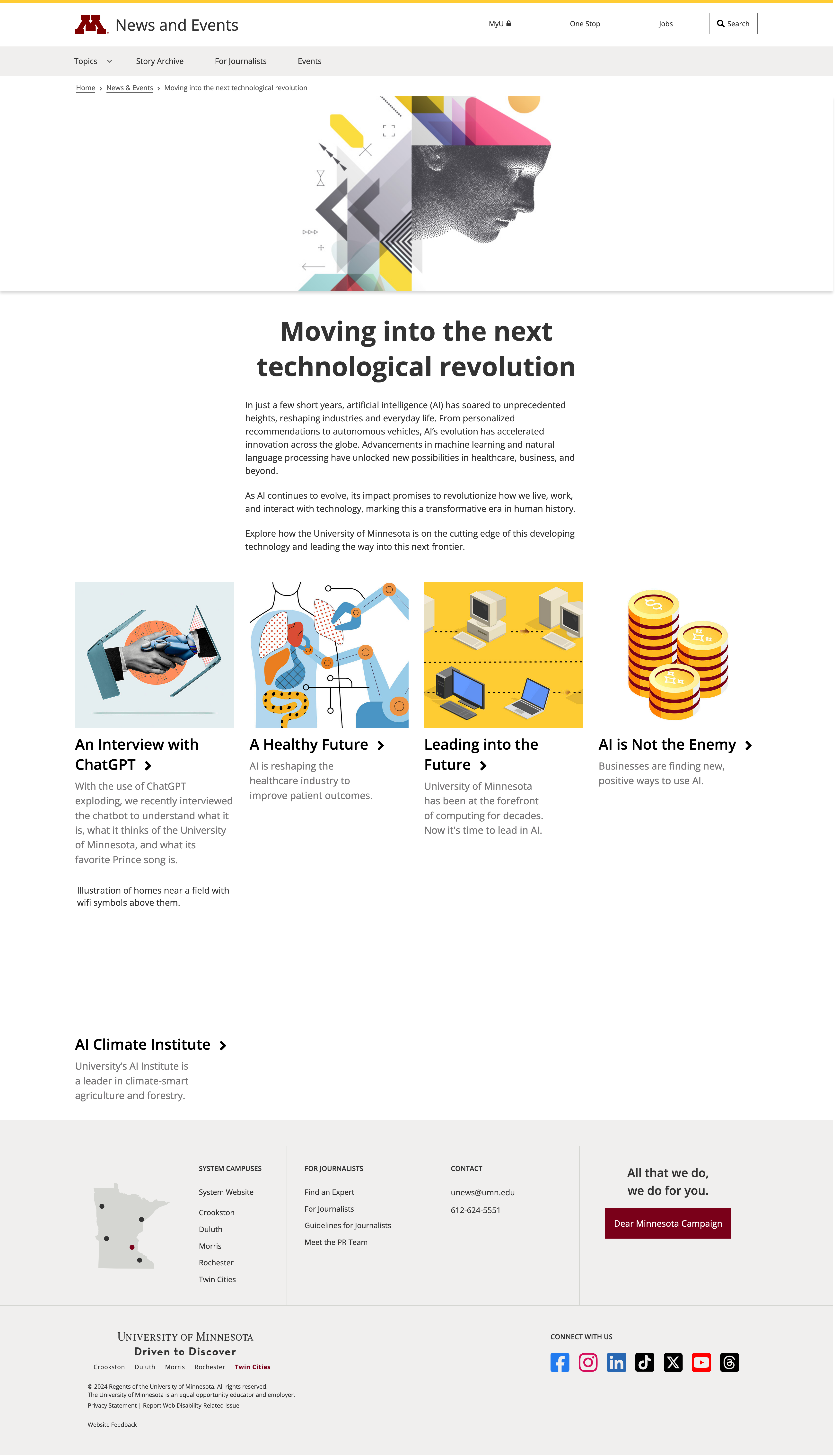 "Moving into the next technological revolution" is a series of featured articles about the impact and work University of Minnesota is doing in the field of artificial intelligence. I developed and customized the pages involved in this series on the existing Drupal site to make them stand out, with a coordinated design to tie them together.