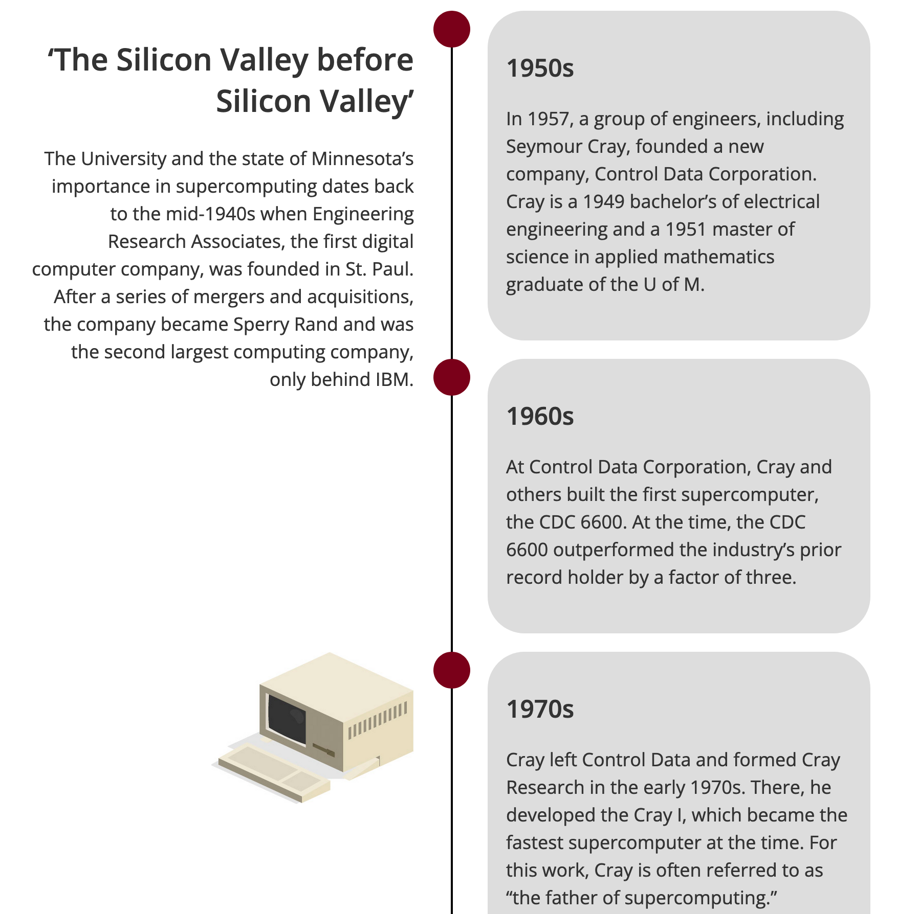 "Leading into the Future" discusses the University of Minnesota's history with computing. To showcase this, I created a responsive timeline with images of different eras of computers. Each item of the timeline animates by sliding up on the middle line as the user scrolls.