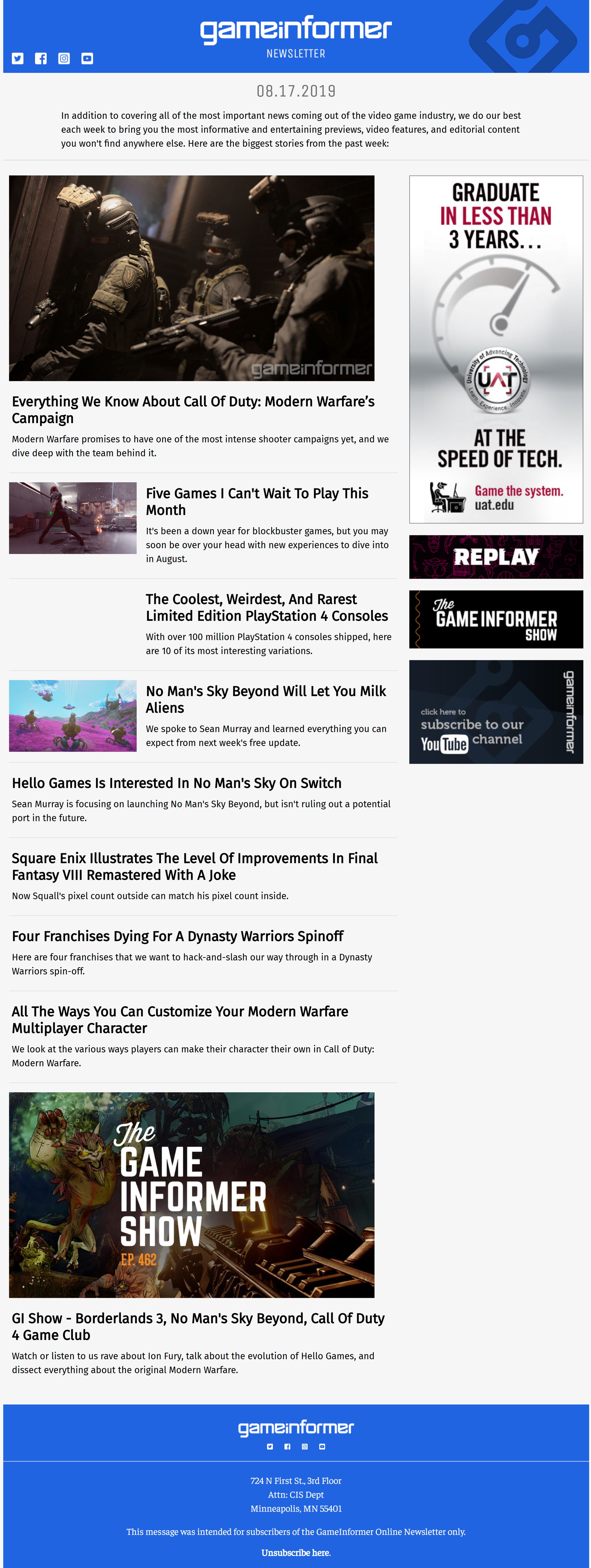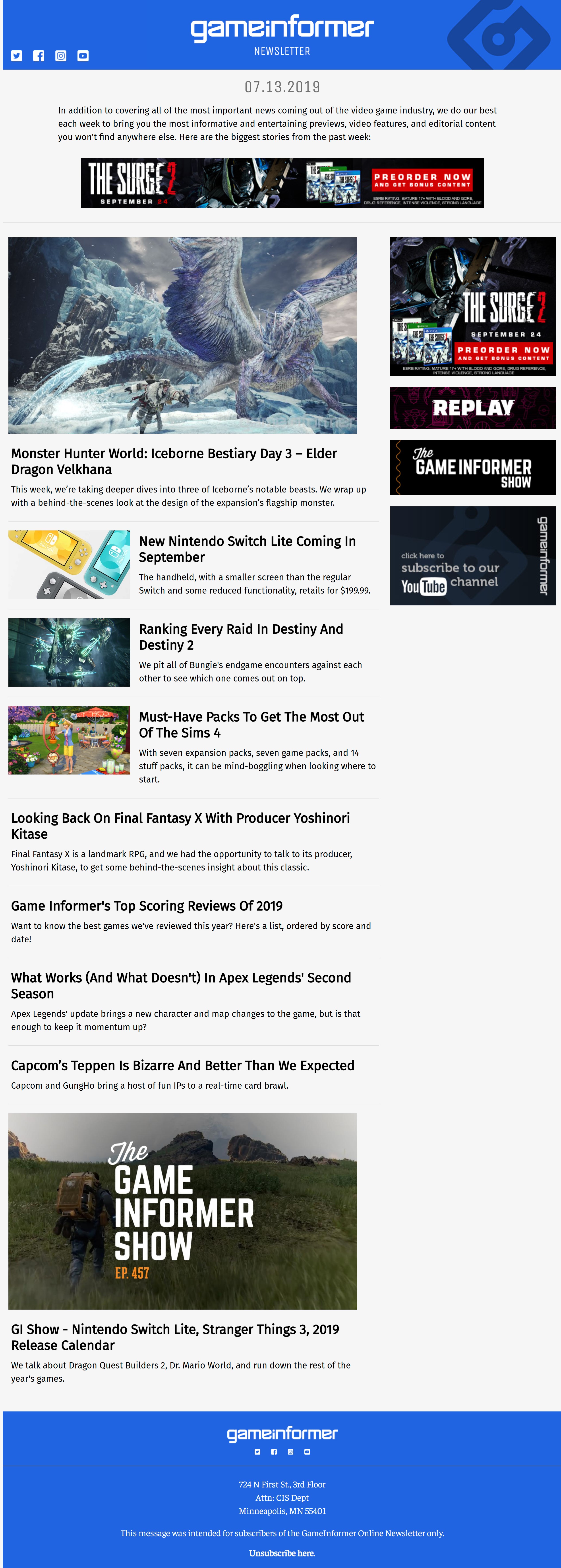To match the updated website design, I developed an updated weekly newsletter for the Game Informer website. I created an HTML template that was updated each week to include popular or notable articles, links, and images, as well as advertisements.