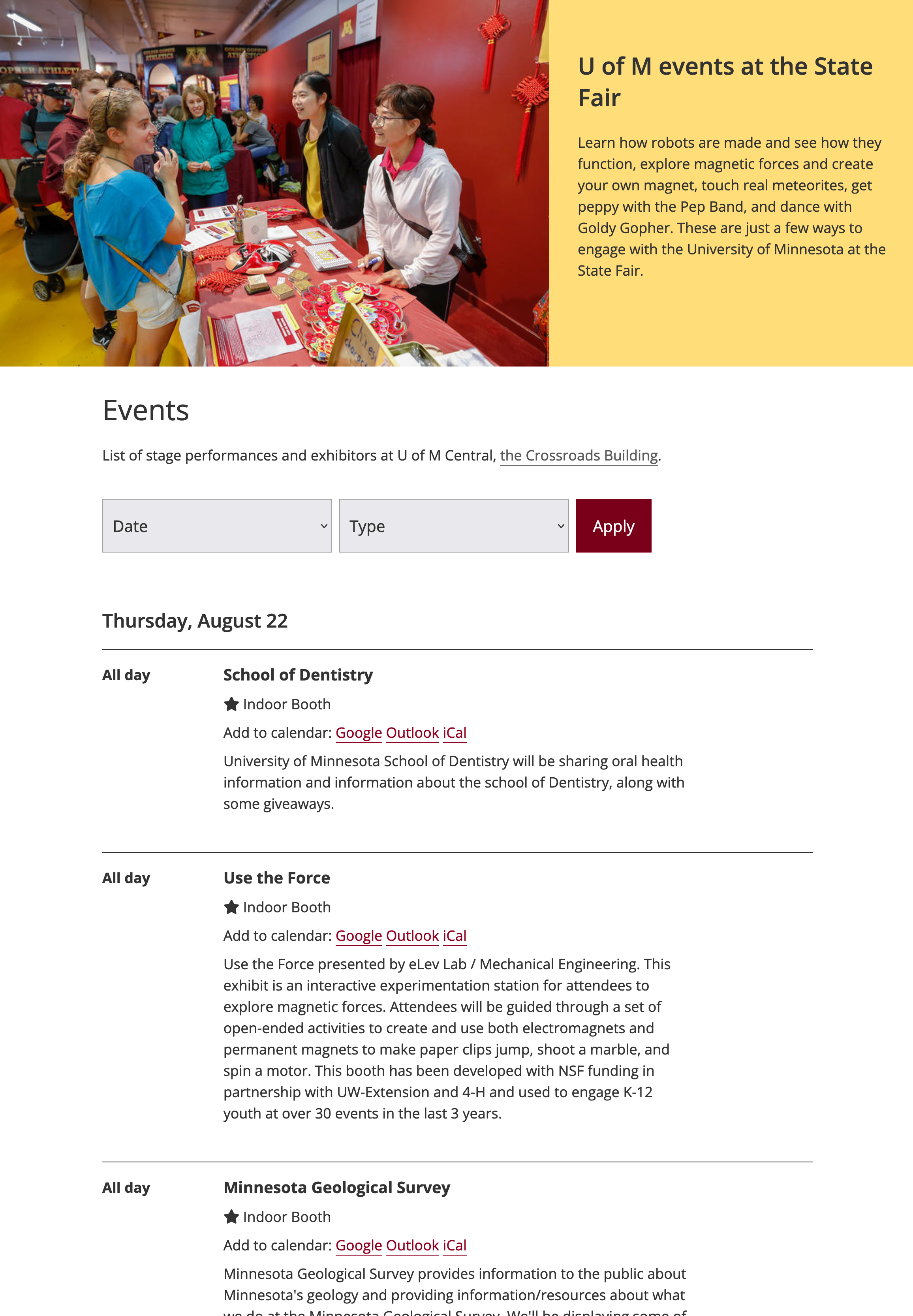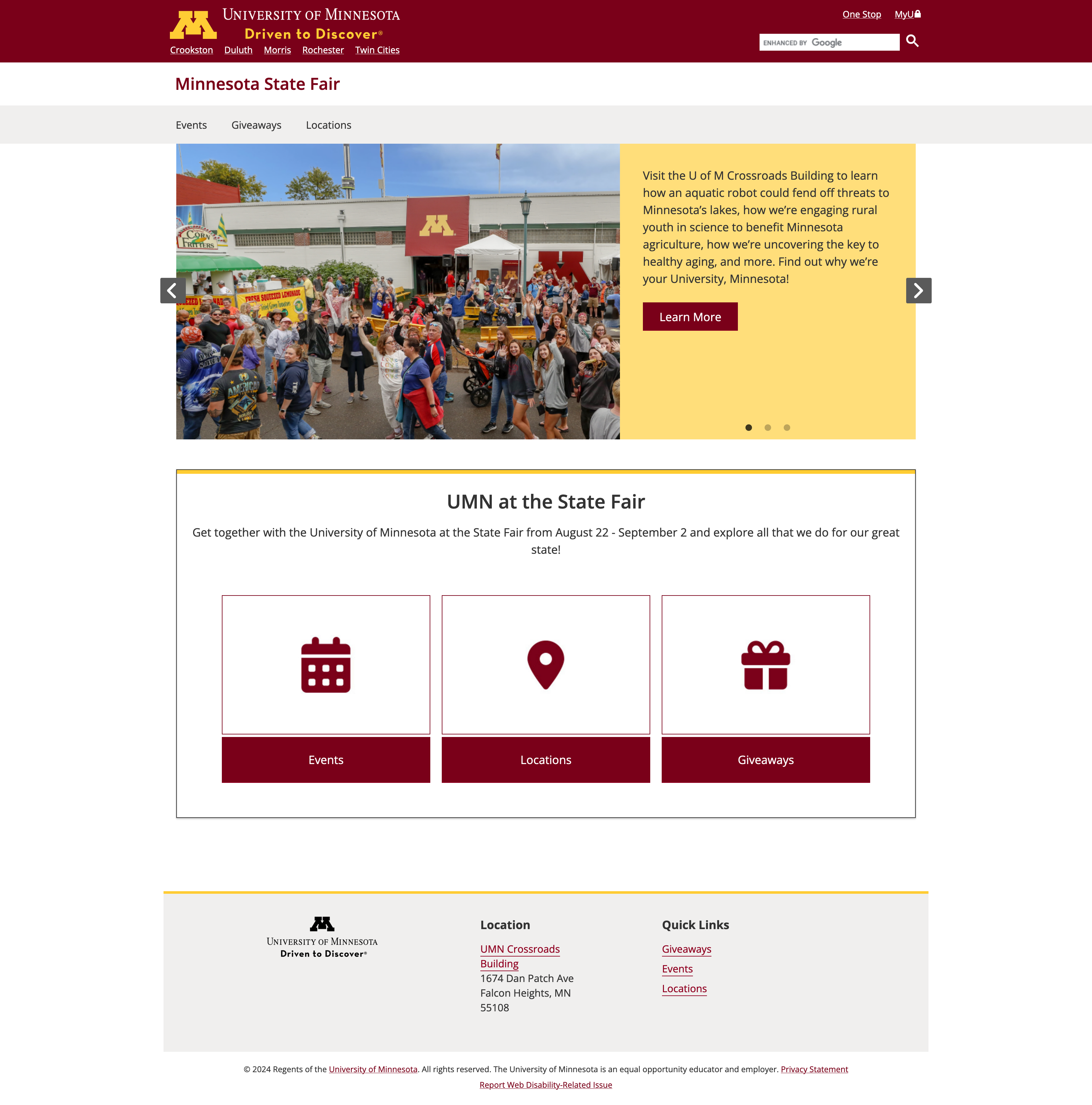 I created a new microsite to promote the University of Minnesota's return to the Minnesota State Fair. A previous microsite had been discontinued a few years earlier and no longer met design or technology requirements. The new site uses the established Folwell design system in Drupal to meet branding and accessibility standards.