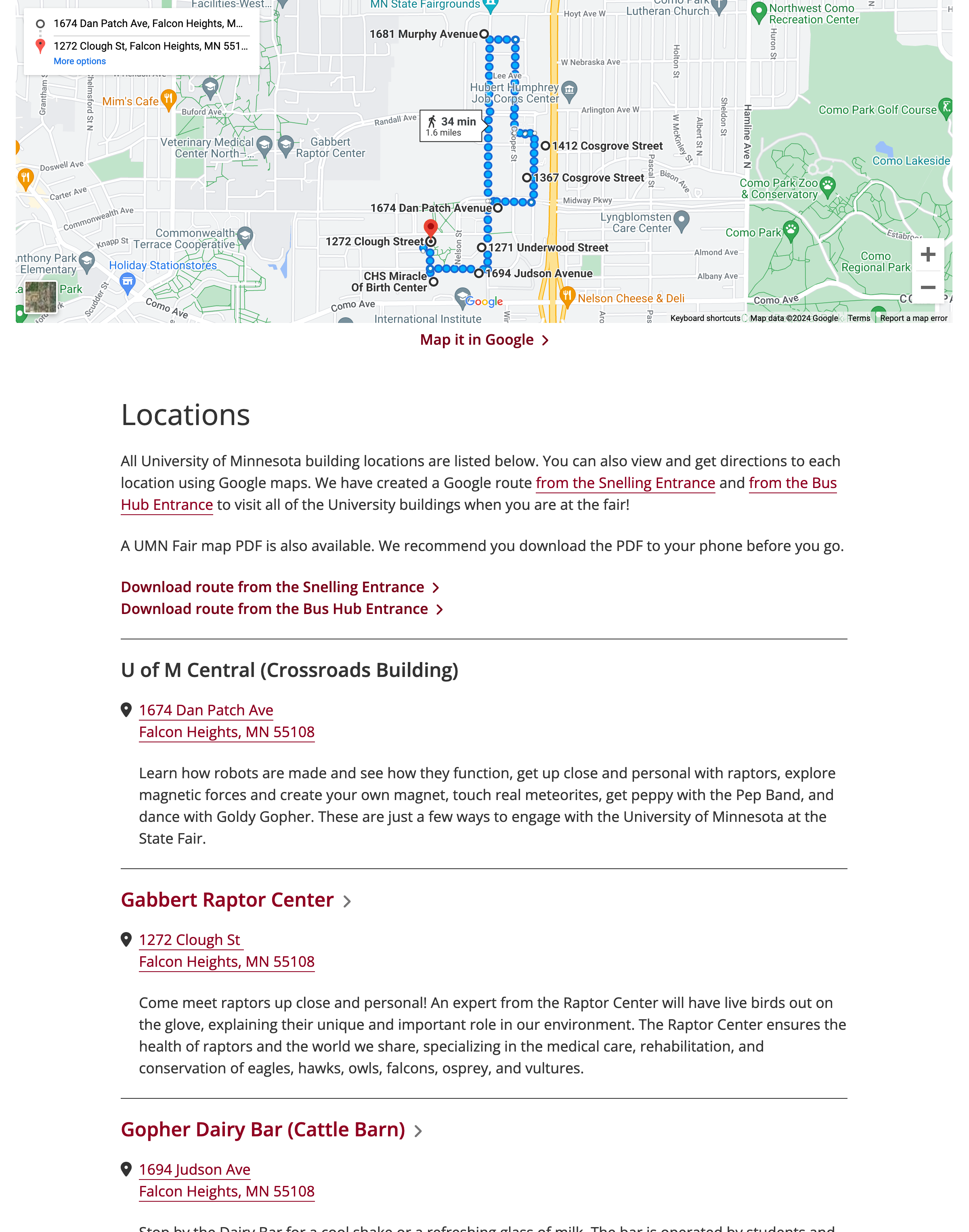 The University was present at several different buildings throughout the Fair. I created a walking path in Google Maps to show how visitors could easily travel between all the locations and embedded that at the top of the page. Each location was also listed on the page with it's address, a link to it's location in Google Maps, and information on what visitors could expect at that spot.